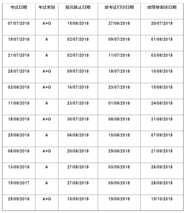 2018年7月至9月用于英國簽證及移民的雅思考試報名截止日期、準考證打印日期和成績(jì)單寄送日期