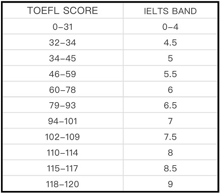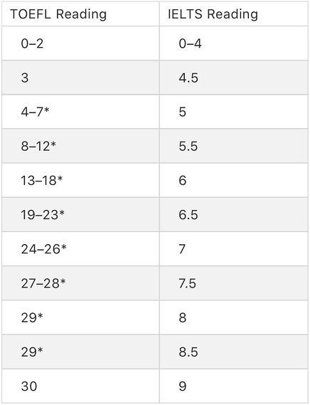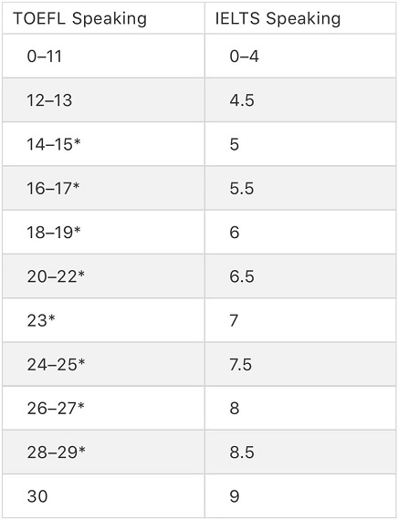 *Indicates score comparison ranges with the highest degree of confidence. The data is based on the analysis of 1,153 individuals who took both the TOEFL test and the IELTS academic module.